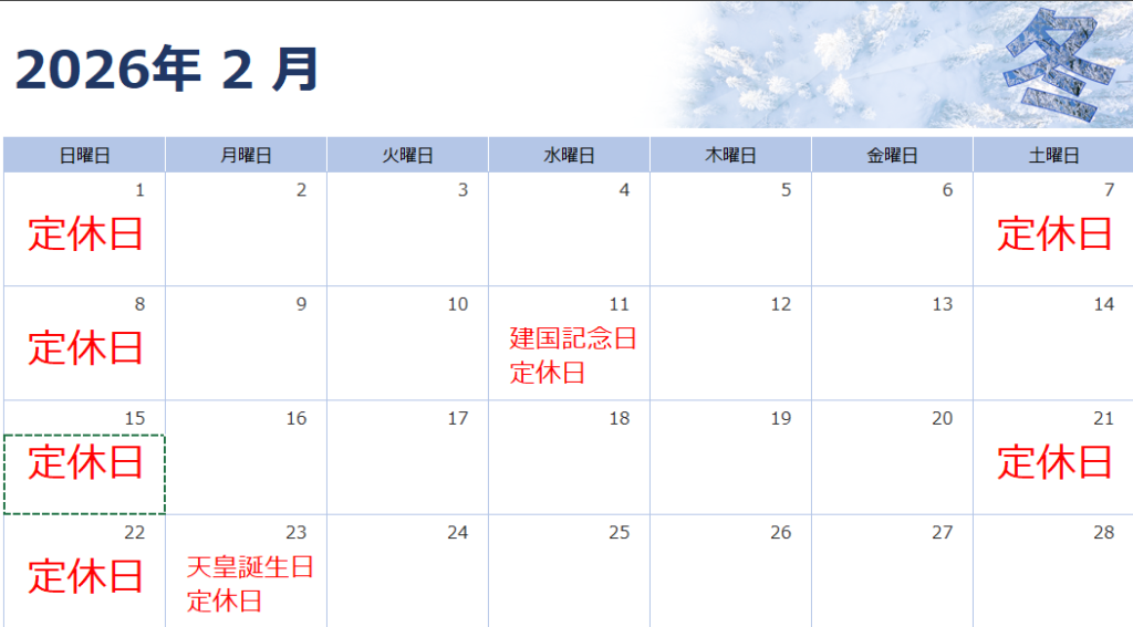また、この大雪への対応により、本来月初にお送りすべき**「1月の営業カレンダー」**の配信が大幅に遅れてしまいました。毎月チェックしてくださっている皆様には、ご不便とご心配をおかけし、心よりお詫び申し上げます。